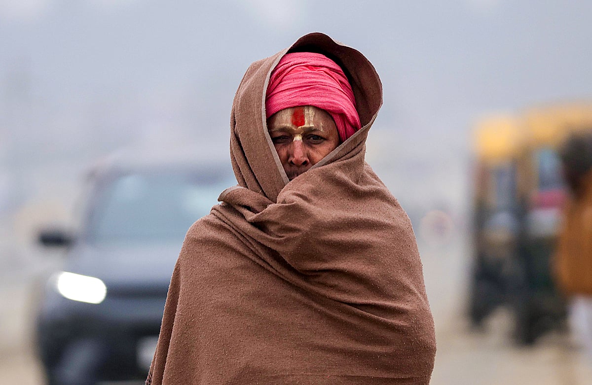 பிரயாக்ராஜ் திரிவேணி சங்கமத்தில், குளிர்கால காலைப்பொழுதில் தன்னை கதகதப்பான வைத்துகொள்ள ஆடைகளால் போர்த்திக்கொண்டு வரும் பக்தர் ஒருவர்.