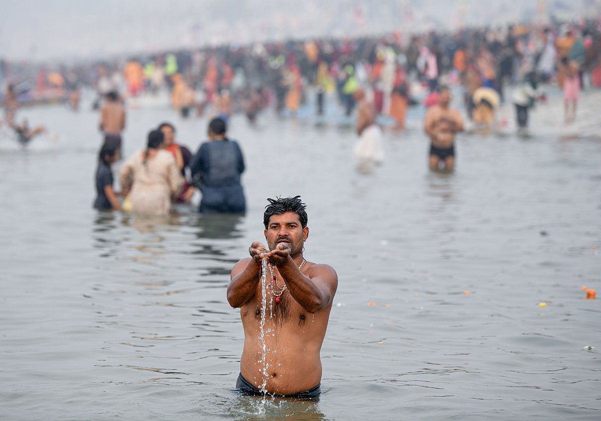 மகா கும்பமேளா முன்னிட்டு ஆற்றில் நீராடிய பிறகு சூரியனை நோக்கி பிரார்த்தனை செய்யும் பக்தர் ஒருவர்.