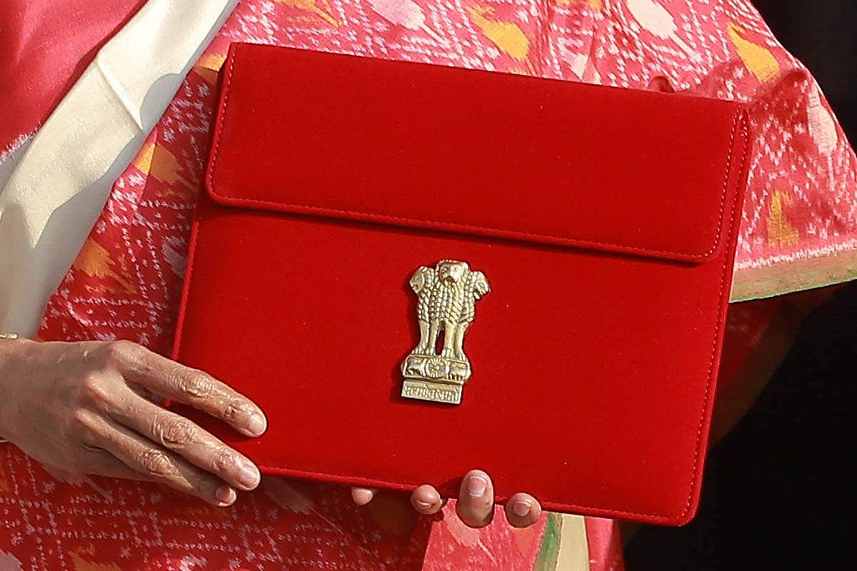 2021-22ஆம் நிதியாண்டிற்கான மத்திய பட்ஜெட்டை தாக்கல் செய்ய முக்கிய தகவல்கள் அடங்கிய கோப்புகளை சிவப்பு நிற வெல்வெட் துணியில் வைத்து கையில் எடுத்து வரும் மத்திய நிதியமைச்சர் நிர்மலா சீதாராமன்.