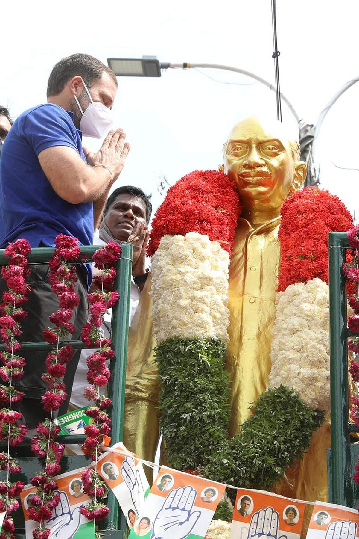 தமிழகம் வந்துள்ள காங்கிரஸ் எம்.பி. ராகுல் காந்தி, காமராஜர் சிலைக்கு மாலை அணிவித்து பிரசாரத்தை மேற்கொண்டார். இடம்: கரூர் படம்: ட்விட்டர்