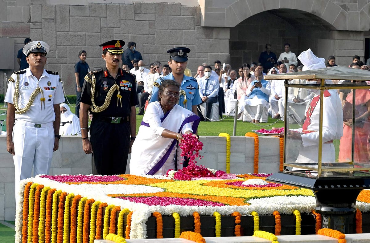 மகாத்மா காந்தியின் 153வது பிறந்தநாளையொட்டி தில்லி ராஜ்காட்டில் அமைந்த அவரது சமாதியில் மலர்தூவி மாரியாதை செலுத்திய குடியரசுத் தலைவர் திரெளபதி முா்மு.