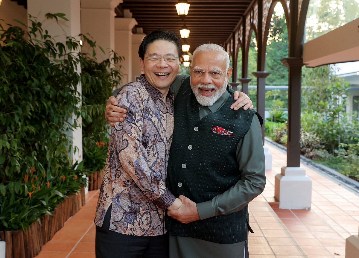அரசு முறை பயணமாக சிங்கப்பூர் சென்றுள்ள பிரதமர் நரேந்திர மோடியை நேரில் சென்று வரவேற்ற சிங்கப்பூர் பிரதமர் லாரன்ஸ் வாங்.