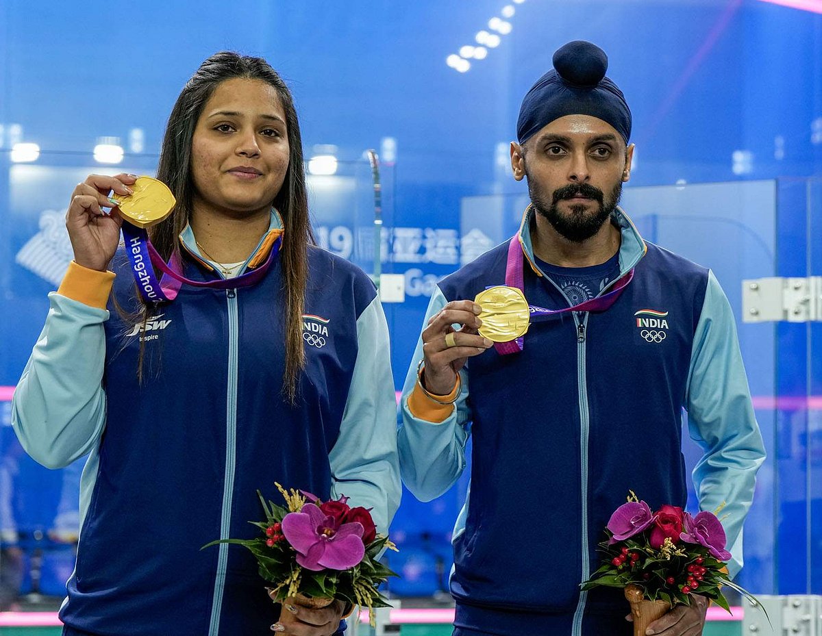 சீனாவின் ஹாங்சோ நகரில் நடைபெற்று வரும் 19வது ஆசிய விளையாட்டுப் போட்டியில் கலப்பு இரட்டையர் ஸ்குவாஷ் போட்டியில் தங்கப் பதக்கம் வென்ற இந்தியாவின் தீபிகா பல்லிகல் மற்றும் ஹரிந்தர் பால் சிங் சந்து.
