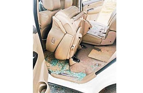தாக்குதல் நடத்தப்பட்டதால் காரின் உள்பகுதியில் சிதறிக் கிடக்கும் கண்ணாடித் துகள்கள்.