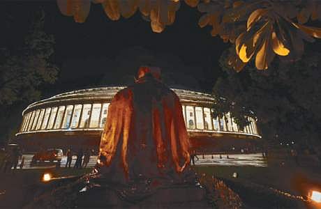 ஜிஎஸ்டியை அமல்படுத்துவதை முன்னிட்டு, வெள்ளிக்கிழமை இரவு மின் விளக்குகளால் அலங்கரிக்கப்பட்ட நாடாளுமன்றக் கட்டடம்.