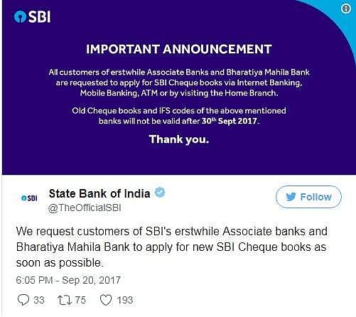 இதில்லாமல், ஸ்டேட் பாங்க் ஆஃப் பாட்டியாலா, ஸ்டேட் பாங்க் ஆப் பிகானீர் மற்றும் ஸ்டேட் பாங்க் ஆஃப் ஜெய்ப்பூர், ஸ்டேட் பாங்க் ஆஃப் ராய்ப்பூர், ஸ்டேட் பாங்க் ஆஃப் திருவாங்கூர், ஸ்டேட் பாங்க் ஆஃப் ஹைதராபாத் ஆகிய ஆறு வங்கிகளின் கிளைகளில் கணக்கு வைத்திருக்கும் வாடிக்கையாளர்கள் புதிய காசோலைகளைப் பெற்றுக் கொள்ளுமாறு அறிவுறுத்தியுள்ளது.