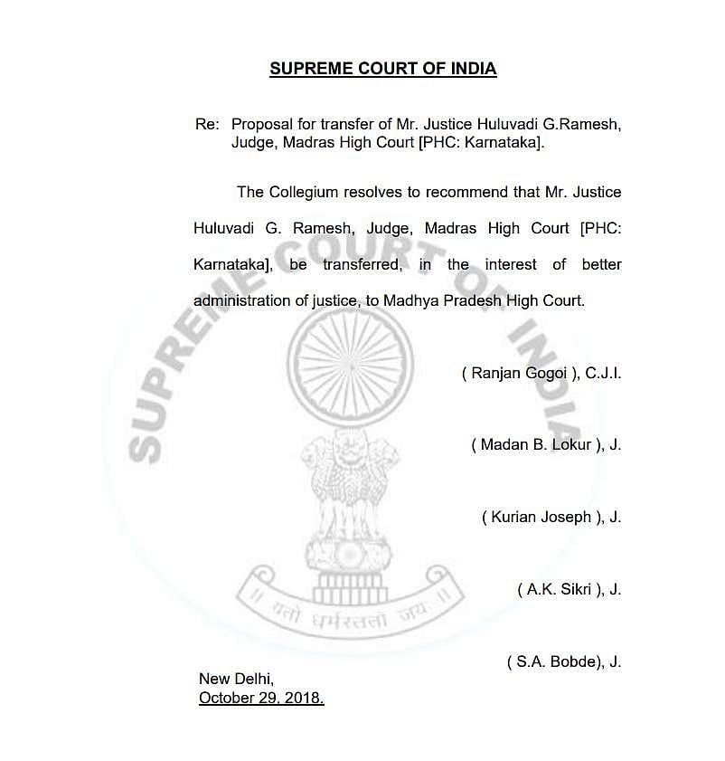 சென்னை உயர் நீதிமன்றத்தில் ஹூலுவாடி ஜி ரமேஷ் 2-ஆவது நீதிபதியாக உள்ளார். மத்தியப் பிரதேச உயர் நீதிமன்ற நிர்வாகம் மேலும் சிறப்பாக நடைபெற ஹூலுவாடி ஜி ரமேஷை அங்கு பணிமாற்றம் செய்யக் கோரி உச்ச நீதிமன்றத்தின் தலைமை நீதிபதி ரஞ்சன் கோகோய் தலைமையிலான கொலீஜியம் பரிந்துரைத்துள்ளது.