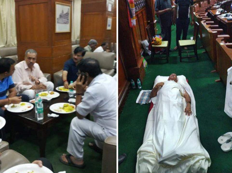 கர்நாடக அரசு மீதான நம்பிக்கை வாக்கெடுப்பு வியாழக்கிழமை நடைபெறாததைக் கண்டித்து, பாஜகவினர் பேரவையில் உள்ளிருப்புப் போராட்டத்தில் ஈடுபட்டனர்.