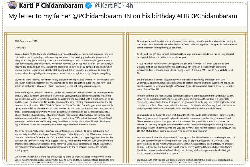 மேலும், அந்த கடிதத்தில், இங்கிலாந்து நாடாளுமன்ற நிகழ்வுகள், அமெரிக்க ஓபன் டென்னிஸ் போட்டியில் ரஃபேல் நடால் கோப்பையை வென்று சாதனை படைத்தது, கடந்த 6 ஆண்டுகளில் இல்லாத அளவுக்கு பொருளாதார வளர்ச்சி 5% ஆக சரிந்ததை, 100 நாள் நிறைவு செய்ததன் வெற்றியாக பாஜக கொண்டாடுவது, சந்திரயான்-2 விண்கலம் திட்டம் தோல்வி அடைந்த போது, இஸ்ரோ தலைவர் சிவனை கட்டி அணைத்து பிரதமர் மோடி ஆறுதல் சொன்னது நாடகம் என்றும், பியூஷ் கோயல் புவியீர்ப்பு விசையைக் கண்டுபிடித்தவர் யார் என்பதில் நியூட்டனுக்கு மாறாக ஐன்ஸ்டீனைக் குறிப்பிட்ட நிகழ்வு என பல்வேறு செய்திகளை கடிதத்தில் சுட்டிக் காட்டியுள்ளார்.