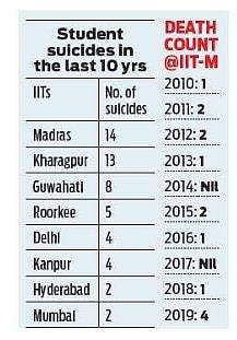 இதில், ஐஐடி-மெட்ராஸில் 14 தற்கொலைகள் அரங்கேறி, முதல் இடத்தில் உள்ளது. நடப்பு ஆண்டில் மட்டும் மெட்ராஸ் ஐஐடியில் நான்கு மரணங்கள் நிகழ்ந்துள்ளன பாத்திமா லத்தீப்பின் தற்கொலை உள்பட. தனது தற்கொலைக்கு பேராசிரியர்கள் மூவர் தான் காரணம் என்று பாத்திமா தனது மொபைல் நோட்டில் குறிப்பிட்டுள்ளார். அதனடிப்படையில் காவல்துறை விசாரணை மேற்கொண்டு வருகிறது.