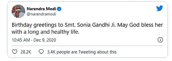 சோனியா காந்திக்கு பிறந்தநாள் வாழ்த்துகள். நல்ல ஆரோக்கியத்துடன் வாழ கடவுள் அவரை ஆசிர்வதிப்பாராக என்று வாழ்த்து தெரிவித்துள்ளார்.