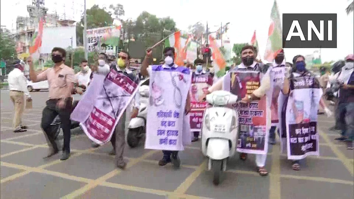 பெட்ரோல், டீசல் விலை உயர்வைக் கண்டித்து ராஜஸ்தான் மாநிலம் புணேவில் நடைபெற்ற ஆர்ப்பாட்டம்.