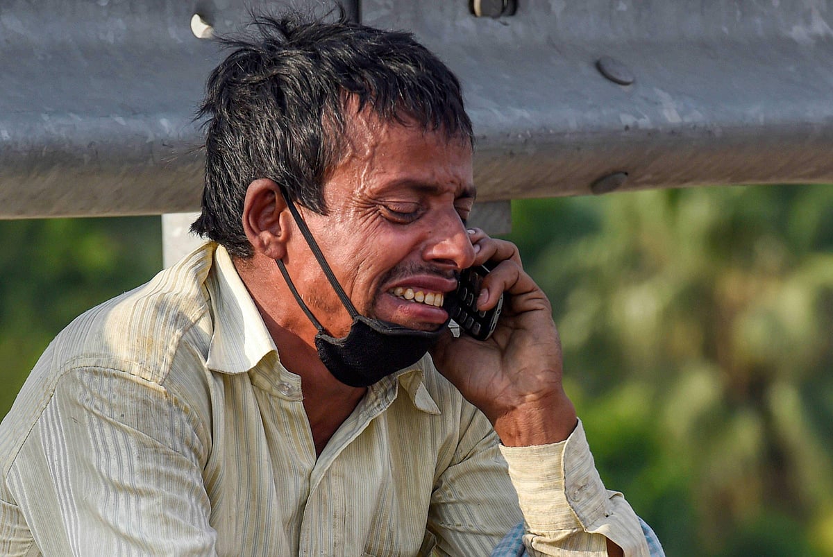 புலம்பெயர் தொழிலாளி ஒருவர் அழுதபடி செல்லிடப்பேசியில் பேசிக் கொண்டிருக்கும் இந்த புகைப்படத்தை எடுத்தவர் பிடிஐ புகைப்படக் கலைஞர் அதுல் யாதவ்.