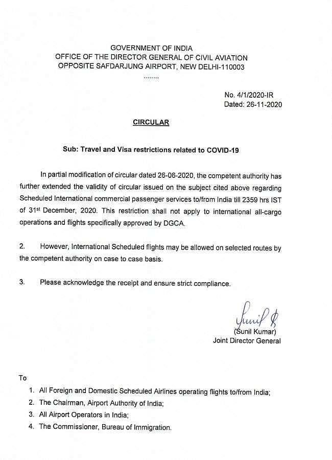 கரோனா பரவல் காரணமாக, கடந்த மார்ச் மாதத்தில் இருந்து சர்வதேச பயணிகள் விமான சேவை ரத்து செய்யப்பட்டுள்ளது. முன்னதாக நவம்பர் மாதம் இறுதி வரை சர்வதேச விமான சேவை ரத்து செய்யப்பட்டிருந்த நிலையில் தற்போது டிசம்பர் 31 வரை நீட்டித்து அறிவிக்கப்பட்டுள்ளது.
