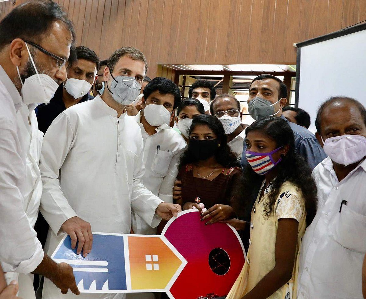 மாவட்ட ஆட்சியர் கூட்டத்தில் கலந்துகொண்ட பின்னர், காவலப்பராவில் கடந்த ஆண்டு நிலச்சரிவில் வீட்டுடன் பெற்றோரை இழந்த சகோதரிகளுக்கு புதிய வவீட்டிற்கான சாவியினை அளித்தார் ராகுல் காந்தி.