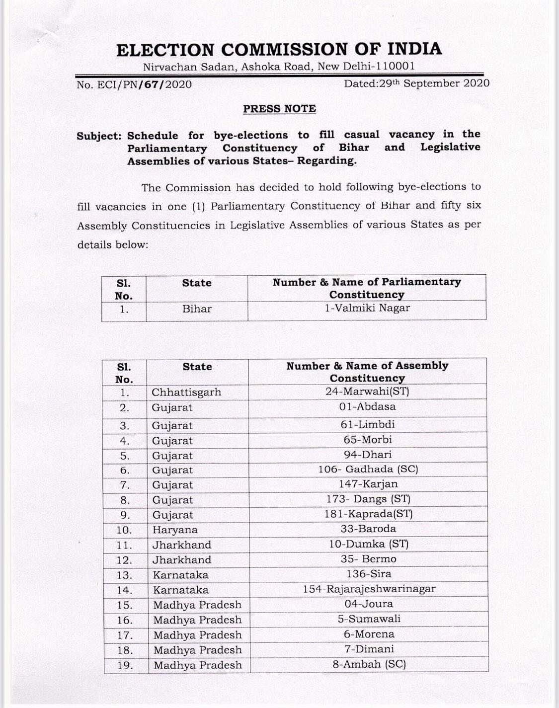 குஜராத், மத்தியப்பிரதேசம் உள்ளிட்ட 10 மாநிலங்களில் காலியாக உள்ள 56 சட்டப்பேரவைத் தொகுதிகளுக்கும், பிகாரில் காலியாக உள்ள ஒரு மக்களவைத் தொகுதிக்கும் இடைத்தேர்தல் குறித்த அறிவிப்பை இந்திய தேர்தல் ஆணையம் வெளியிட்டுள்ளது.