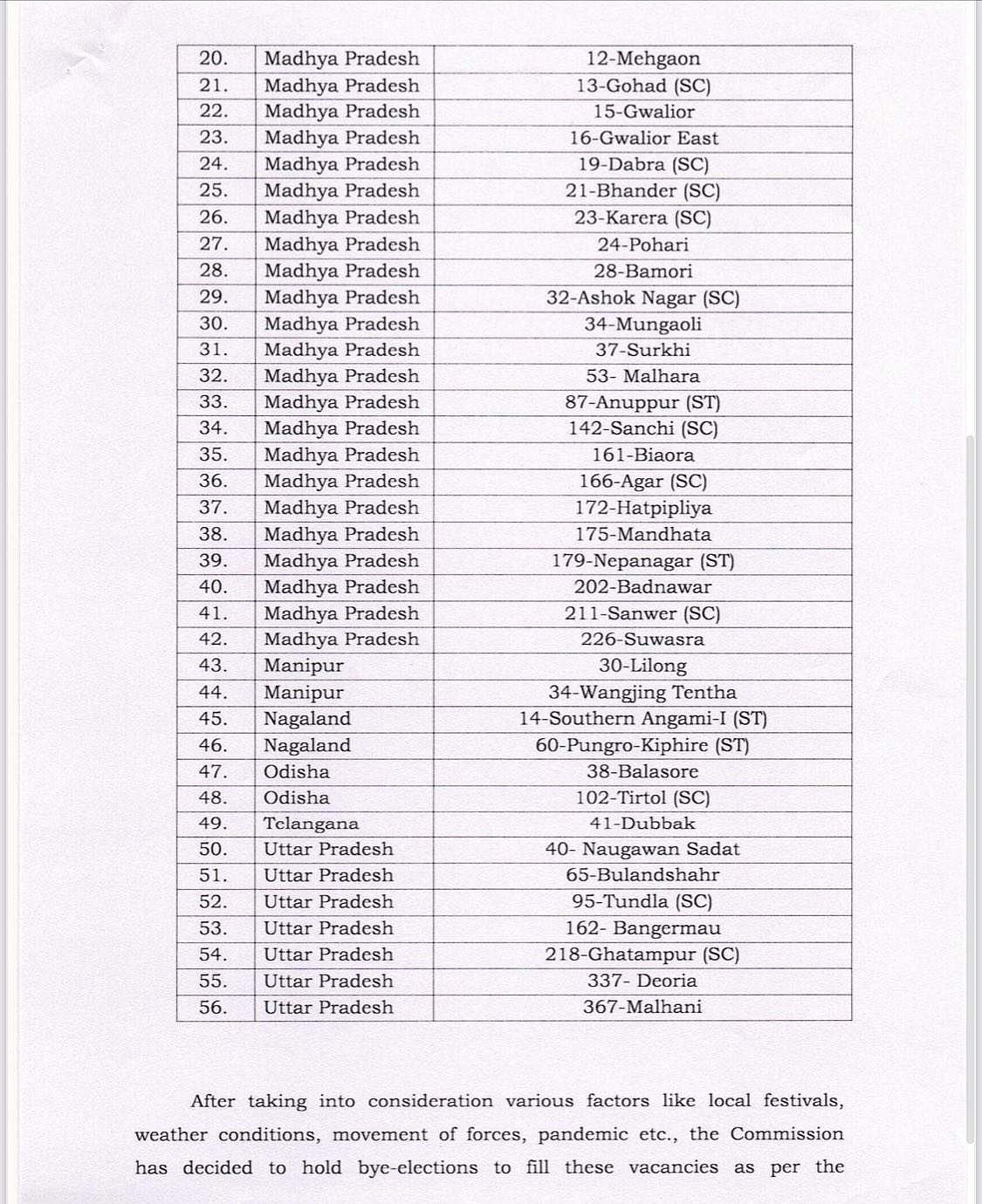 அறிவிப்பின்படி, சத்தீஸ்கர், குஜராத், மத்தியப் பிரதேசம், ஹரியாணா, ஜார்க்கண்ட், கர்நாடகம், நாகலாந்து, ஒடிசா, உத்தரப்பிரதேசம் ஆகிய 9 மாநிலங்களில் காலியாக உள்ள 54 சட்டப்பேரவைத் தொகுதிகளுக்கு நவம்பர் 3 ஆம் தேதி தேர்தல் நடைபெறும்.