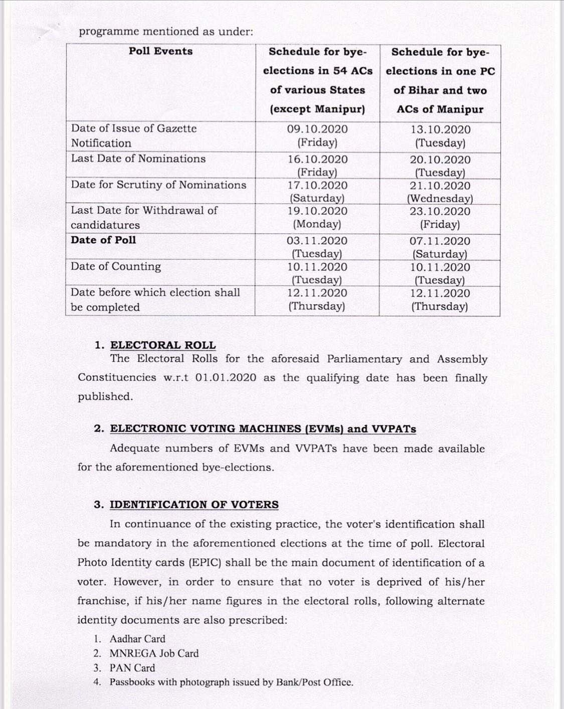 மணிப்பூரில் காலியாக உள்ள இரு சட்டப்பேரவைத் தொகுதிகளுக்கும், பிகாரில் காலியாக உள்ள ஒரு மக்களவைத் தொகுதிக்கும் இடைத்தேர்தல் நவம்பர் 7 ஆம் தேதி நடைபெறும் என்று தெரிவிக்கப்பட்டுள்ளது. மேற்குறிப்பிட்ட அனைத்து தொகுதிகளிலும் வாக்கு எண்ணிக்கை நவம்பர் 10 ஆம் தேதி நடைபெறும்.