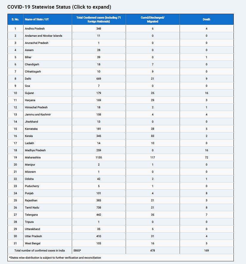 இந்தியாவில் கரோனாவால் பாதிக்கப்பட்டுள்ளோர் எண்ணிக்கை 5,865 ஆக அதிகரித்துள்ளது. நாடு முழுவதும் பல்வேறு மாநிலங்களில் இதுவரை 169 பேர் உயிரிழந்துள்ளனர். அதேபோன்று கரோனா சிகிச்சை பெற்று குணமடைந்தோர் எண்ணிக்கை 478 ஆக அதிகரித்துள்ளது.