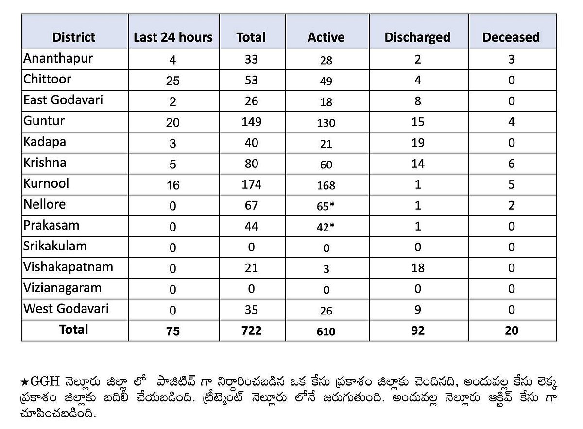 ஆந்திர மாநிலத்தில் கடந்த 24 மணி நேரத்தில் கரோனா 75 பேருக்கு கரோனா பாதிப்பு உறுதி செய்யப்பட்டதை அடுத்து, மாநிலத்தில் கரோனா பாதித்தோர் எண்ணிக்கை 722 ஆக உயர்ந்துள்ளது.