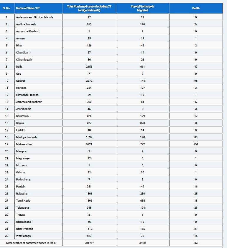 இந்நிலையில், இந்தியாவில் கரோனா பாதிப்பு எண்ணிக்கை 20 ஆயிரத்தைத் தாண்டியுள்ளது. பாதிப்பு எண்ணிக்கை 20,471 ஆகவும், பலி எண்ணிக்கை 652 ஆகவும் அதிகரித்துள்ளது. இதுவரை3,960 பேர் குணமடைந்து வீட்டிற்குத் திரும்பியுள்ளனர்.