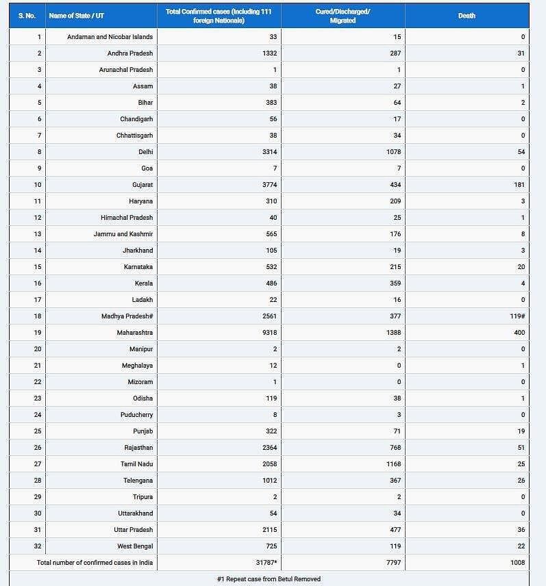 இந்தியாவில் கரோனாவால் பாதிக்கப்பட்டவா்களின் எண்ணிக்கை 31,332-இல் இருந்து 31,787 ஆக அதிகரித்துள்ளது. மேலும் வைரஸ் தொற்றுக்கு உயிரிழந்தவா்களின் எண்ணிக்கை 1,007 -இல் இருந்து 1,008 ஆக உயர்ந்துள்ளது.