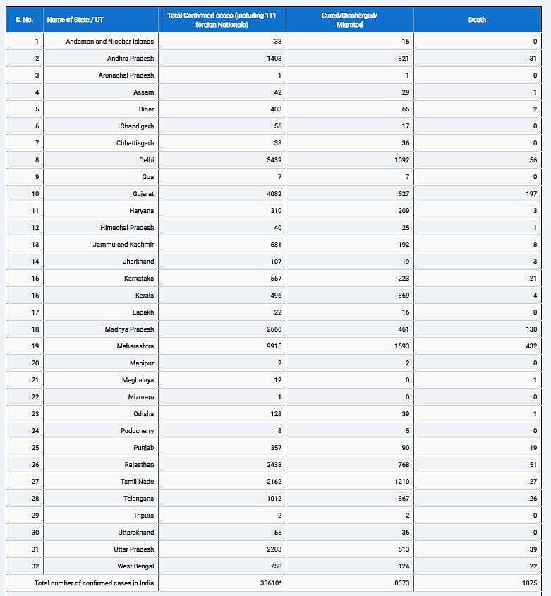இந்தியாவில் கரோனாவால் பாதிக்கப்பட்டோர் எண்ணிக்கை நாளுக்கு நாள் அதிகரித்து வருகிறது. தற்போதைய நிலவரப்படி, இந்தியாவில் கரோனா பாதிப்பு எண்ணிக்கை 33,050-ல் இருந்து 33,610 ஆக அதிகரித்துள்ளது. உயிரிழந்தோா் எண்ணிக்கை 1,074-ல் இருந்து 1,075 ஆக அதிகரித்துள்ளது. இதுவரை 8,373 பேர் குணமடைந்துள்ளனர்.