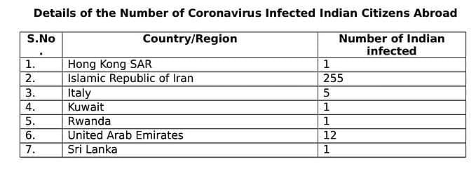 அதன்படி, அதிகபட்சமாக ஈரானில் 255 பேர், ஐக்கிய அரபு அமீரகத்தில் 12 பேர், இத்தாலியில் 5 பேர், ஹாங்காங், குவைத், ருவாண்டா, இலங்கையில் தலா ஒருவர் என மொத்தம் 276 வெளிநாடுவாழ் இந்தியர்களுக்கு கரோனா பாதிப்பு உள்ளதாக தகவல் வெளியிடப்பட்டுள்ளது.