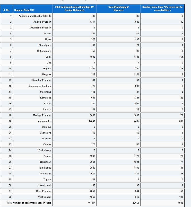 இந்தியாவில் கரோனாவால் பாதிக்கப்பட்டோர் எண்ணிக்கை நாளுக்கு நாள் அதிகரித்து வருகிறது. செவ்வாய்க்கிழமை மாலை நிலவரப்படி, இந்தியாவில் கரோனா பாதிப்பு எண்ணிக்கை 46,711 ஆக அதிகரித்துள்ளது. உயிரிழந்தோா் எண்ணிக்கை 1,583 ஆக உயர்ந்துள்ளது. இதுவரை 13,161 பேர் குணமடைந்துள்ளனர்.