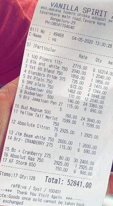 முன்னதாக, பெங்களூருவில் 52 ஆயிரத்துக்கு ஒரே நபர் மதுபானம் வாங்கி அந்த ரசீது வாட்ஸ்ஆப் உள்ளிட்ட வலைத்தளங்களில் பரவ, அதற்குப் போட்டியாக ரூ.95 ஆயிரத்துக்கு ஒருவர் மதுவாங்கிய பில் களத்தில் இறங்கியது.