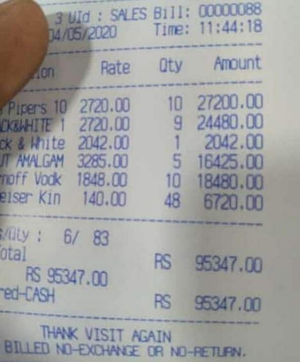 இதற்கிடையே மங்களூருவில் ரூ.59,952க்கு மதுபானம் வாங்கிய ரசீதும் வலைத்தளங்களில் வைரலானது. இதையெல்லாம் விஞ்சி, அனைவரையும் அதிர்ச்சியடைய வைக்கும் வகையில், ஒரே நபர் ரூ.95,347க்கு மதுபானம் வாங்கியிருக்கும் ரசீதும் வைரலானது. ஆனால், அதில் வாங்கப்பட்ட இடம் குறித்த தகவல்கள் மறைக்கப்பட்டுள்ளன.