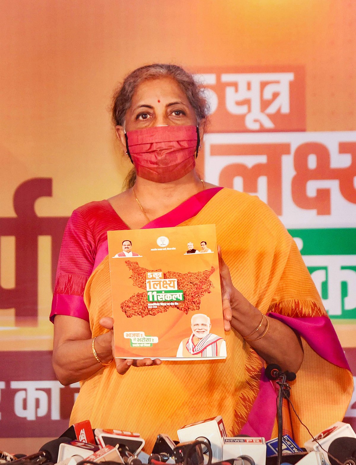 பிகார் பேரவைத் தேர்தலுக்கான பாஜகவின் வாக்குறுதிகள் அடங்கிய தேர்தல் அறிக்கையை மத்திய நிதியமைச்சர் நிர்மலா சீதாராமன் இன்று வெளியிட்டார்.