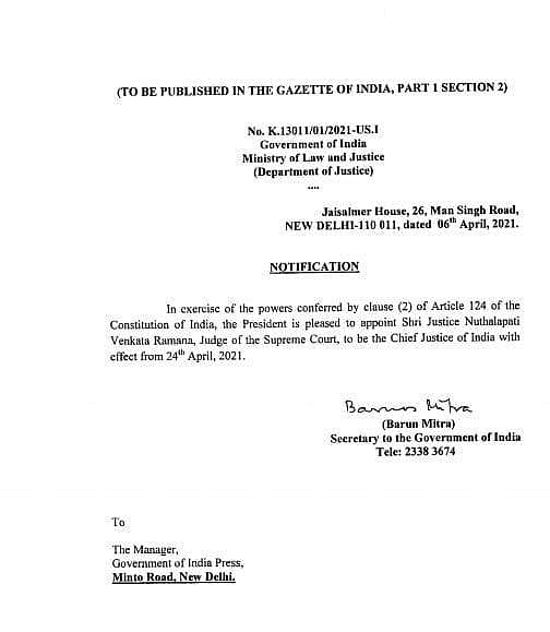 இது குறித்து மத்திய அரசு வெளியிட்டிருக்கும் அறிவிக்கையில், நீதிபதி ரமணா, உச்ச நீதிமன்றத்தின் 48-வது தலைமை நீதிபதியாக ஏப்ரல் 24-ஆம் தேதி பதவியேற்றுக் கொள்கிறார்.