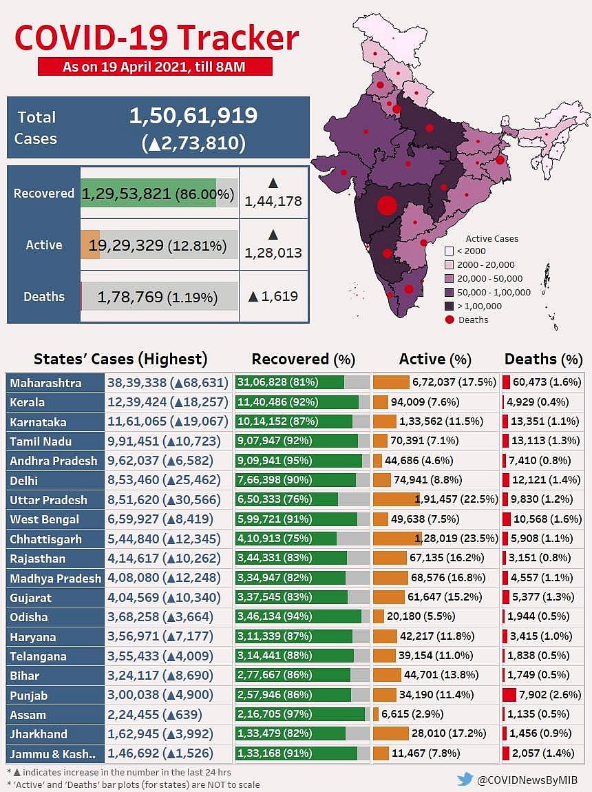 நாட்டில் கடந்த 24 மணி நேரத்தில் புதிதாக 2,73,810 பேருக்கு கரோனா தொற்று உறுதி செய்யப்பட்டுள்ளது. மேலும் 1,619 பேர் கரோனாவுக்குப் பலியாகினர். கரோனா பேரிடர் தொடங்கியது முதலே ஒரு நாள் பாதிப்பு புதிய உச்சத