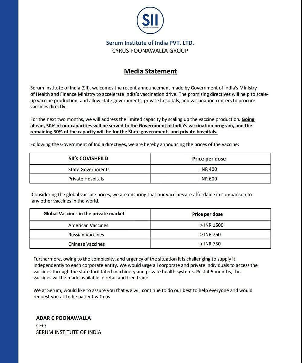 மத்திய அரசு வெளியிட்டிருக்கும் வழிகாட்டு நெறிமுறைகளைப் பின்பற்றி, விலை உயர்வு அறிவிக்கப்பட்டிருப்பதாகவும் தெரிவிக்கப்பட்டுள்ளது. மேலும் எங்களது ஒட்டுமொத்தத் உற்பத்தியில் 50 சதவீத உற்பத்தியை மத்திய அரசு செயல்படுத்தும் கரோனா தடுப்பூசி திட்டத்துக்கும், 50 சதவீத உற்பத்தியை மாநில அரசுகள் மற்றும் தனியார் மருத்துவமனைகளுக்கும் வழங்கப்படும் என்றும் தெரிவிக்கப்பட்டுள்ளது.