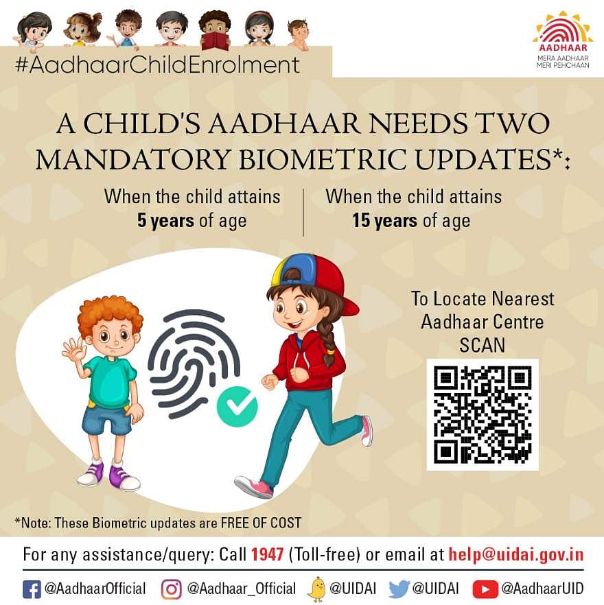 ஆதார் அமைப்பு இது குறித்து சமூக வலைத்தளங்கள் மூலம் மக்களுக்கு விழிப்புணர்வை ஏற்படுத்தி வருகிறது. அதில், பால் ஆதார் அட்டை குழந்தையின் 5 வயது வரையில்தான் செல்லுபடியாகும். 5 வயதுக்குப் பிறகு குழந்தையின் கைரேகை உள்ளிட்டவை பையோ மெட்ரிக் முறையில் பதிவு செய்யாமல் விட்டுவிட்டால், அது செல்லாததாகிவிடும் என்று தெரிவிக்கப்பட்டுள்ளது.