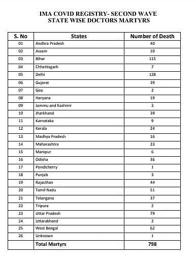 கரோனா இரண்டாவது அலையின்போது இந்தியாவில் 798 மருத்துவர்கள் உயிரிழந்துள்ளதாக இந்திய மருத்துவ சங்கம் தெரிவித்துள்ளது.