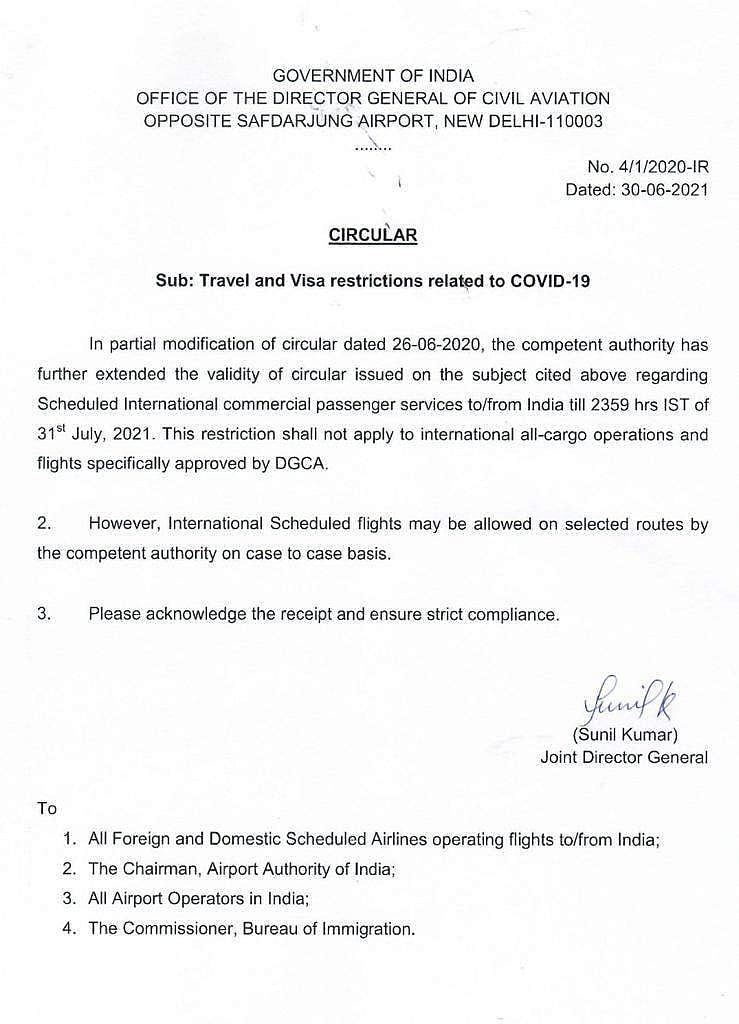 கரோனா பரவல் காரணமாக சர்வதேச பயணிகள் விமான சேவை ரத்து செய்யப்பட்டுள்ளது. இதனை தற்போது ஜூலை 31 ஆம் தேதி வரை நீட்டித்து அறிவிப்பு வெளியிட்டுள்ளது.