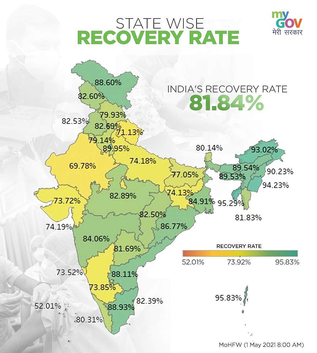 நாட்டில் கரோனா பாதித்து தொற்றிலிருந்து குணமடைவோர் விகிதம் மே 1-ஆம் தேதி காலை நிலவரப்படி 81.84 சதவீதமாக உள்ளது.