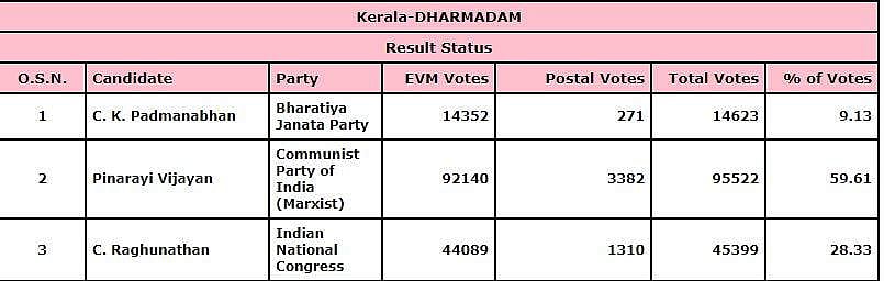 தர்மடம் சட்டப்பேரவைத் தொகுதியில் போட்டியிட்ட முதல்வர் பினராயி விஜயன் 95,522 வாக்குகள் பெற்றுள்ளார். இவருக்கு எதிராக போட்டியிட்ட காங்கிரஸ் கட்சியின் சி. ரகுநாதன் 45,399 வாக்குகள் பெற்றுள்ளார்.