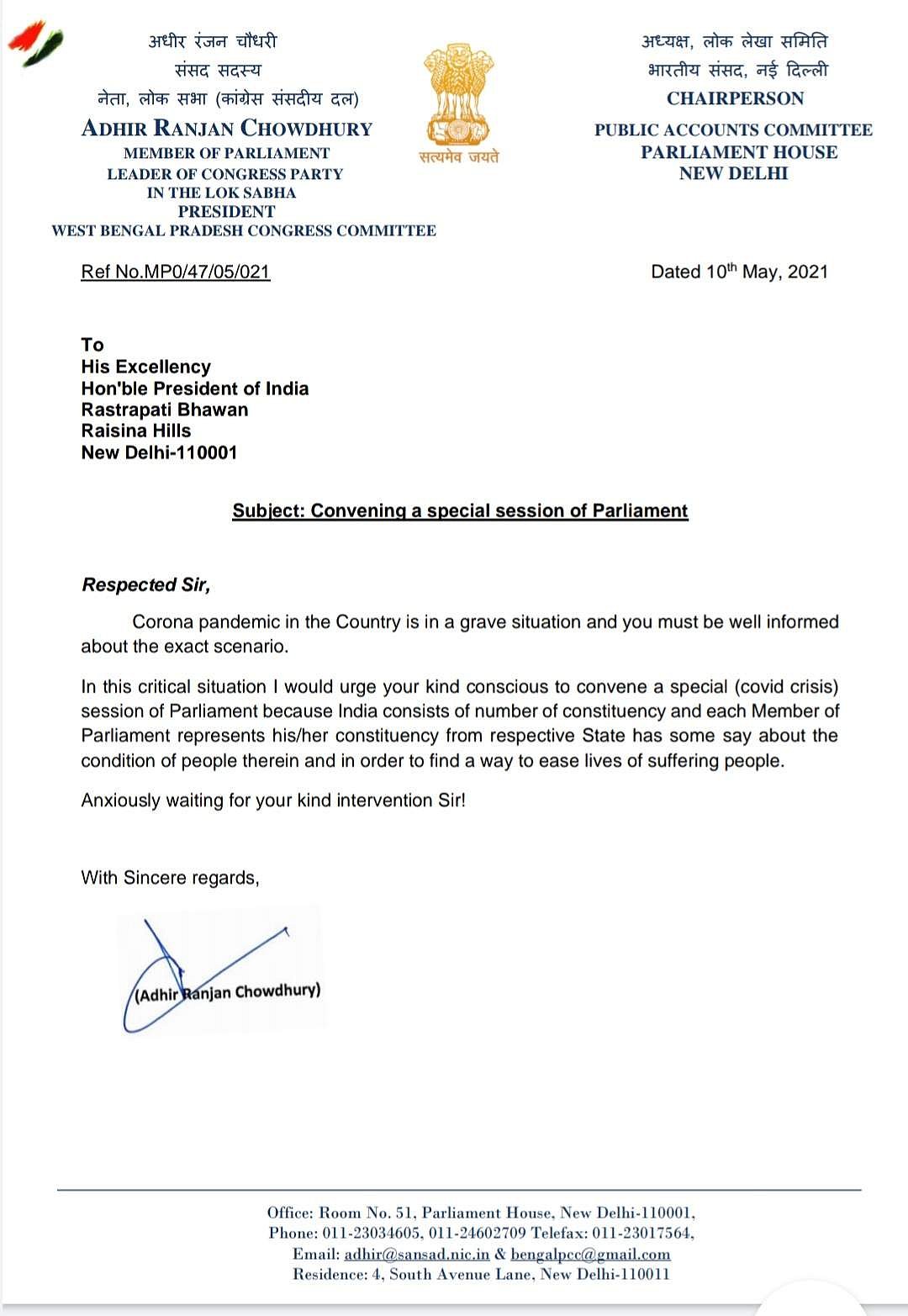 கரோனா பேரிடர் தொடர்பாக விவாதிக்க நாடாளுமன்ற சிறப்பு கூட்டத்தை கூட்டுமாறு காங்கிரஸ் மூத்தத் தலைவர் ஆதிர் ரஞ்சன் சௌத்ரி குடியரசுத் தலைவர் ராம்நாத் கோவிந்திற்கு கடிதம் எழுதியுள்ளார்.