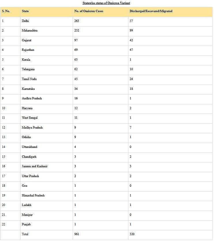 ஒமைக்ரான் வகை கரோனா தொற்றால் பாதிக்கப்பட்ட மாநிலங்கள் குறித்த தரவுகளின் பட்டியலை மத்திய சுகாதாரத் துறை வெளியிட்டுள்ளது.