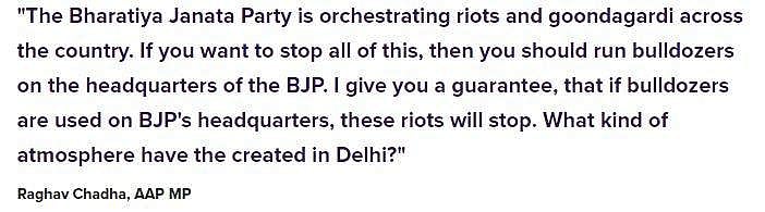 இந்நிலையில் இது தொடர்பாக ட்விட்டரில் பதிவிட்டுள்ள ஆம் ஆத்மி கட்சியின் எம்.பி. ராகவ் சாதா, ''பாரதிய ஜனதா கட்சி நாடு முழுவதும் கலவரங்களையும், குண்டர் சட்டத்தையும் நடத்தி வருகிறது. இதனை நீங்கள் நிறுத்த வேண்டுமென்றால், பாஜக தலைமையகத்தின் மீது புல்டோசரை ஏற்ற வேண்டும். பாஜக தலைமையகத்தின் மீது புல்டோசரை ஏற்றினால் கலவரங்களுக்கு தீர்வு கிடைக்கும் என்று நான் உறுதி அளிக்கிறேன். என்ன மாதிரியான சூழல் தில்லியில் உருவாகியுள்ளது?'' என்று குறிப்பிட்டுள்ளார்.