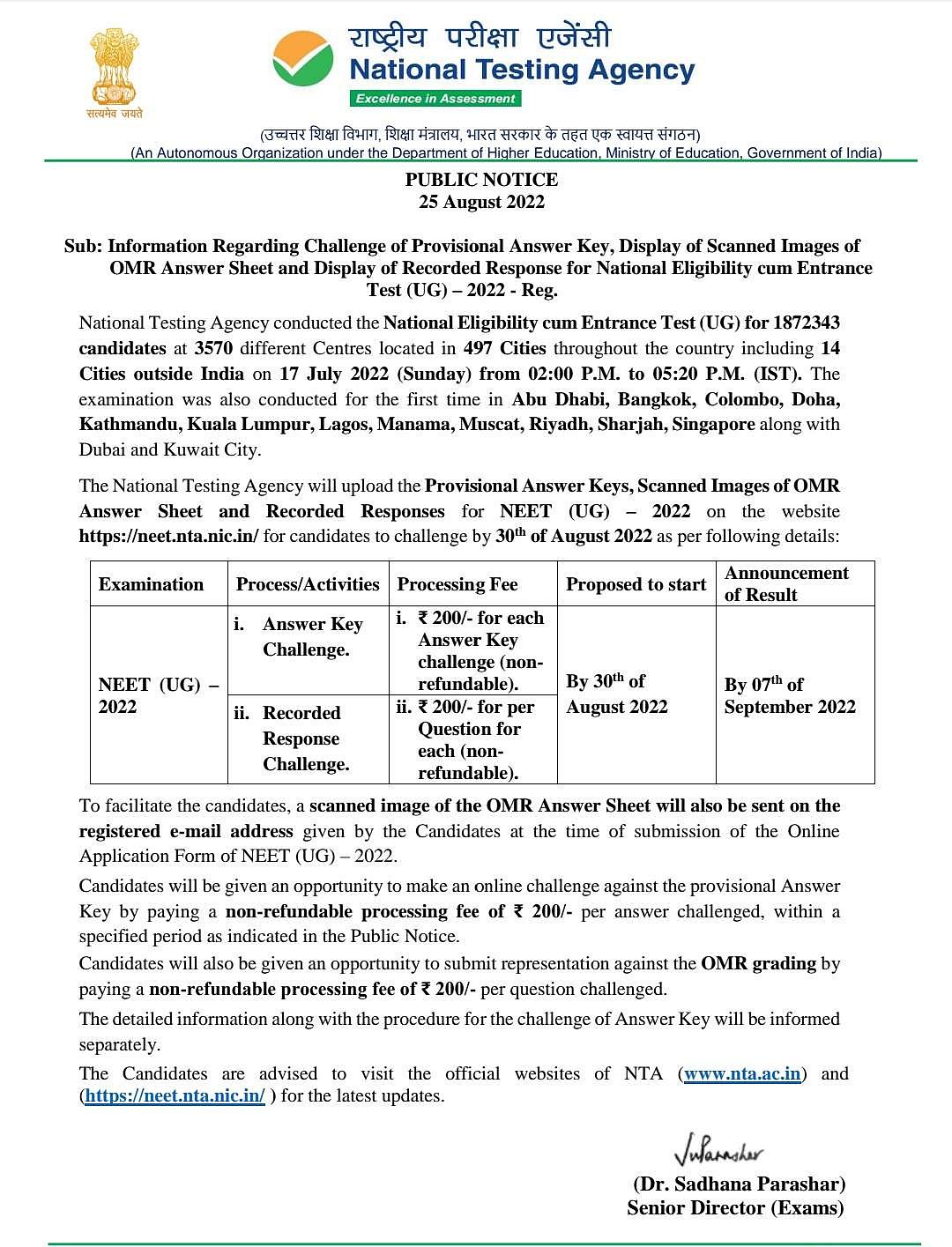 மேலும் தேர்வுக்கான விடைக்குறிப்புகள் வருகிற ஆகஸ்ட் 30 ஆம் தேதி வெளியாகும் என்றும் https://neet.nta.nic.in/ என்ற இணையதள முகவரியில் தெரிந்துகொள்ளலாம் என்றும் தெரிவிக்கப்பட்டுள்ளது.