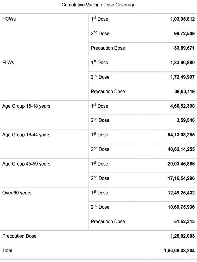 இந்தியாவில் இதுவரை 166.68 கோடி கரோனா தடுப்பூசிகள் செலுத்தப்பட்டுள்ளதாக மத்திய சுகாதாரத்துறை செவ்வாய்க்கிழமை தெரிவித்துள்ளது.
