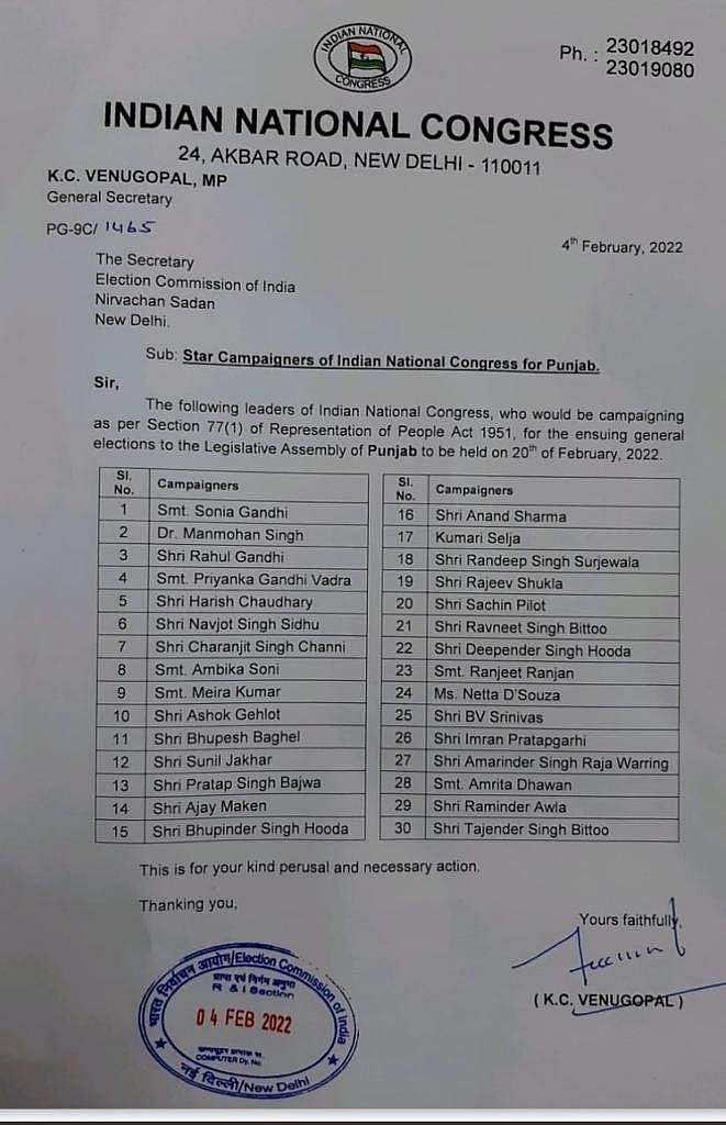 பஞ்சாப் சட்டப்பேரவைத் தேர்தலில் போட்டியிடும் காங்கிரஸ் வேட்பாளர்களை ஆதரித்து பிரசாரம் செய்யவுள்ள நட்சத்திரப் பேச்சாளர்கள் பட்டியல் வெளியிடப்பட்டுள்ளது.