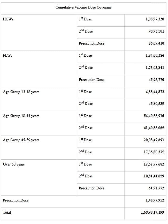 இந்தியாவில் இதுவரை 168.98 கோடி கரோனா தடுப்பூசிகள் செலுத்தப்பட்டுள்ளதாக மத்திய சுகாதாரத்துறை சனிக்கிழமை தெரிவித்துள்ளது.