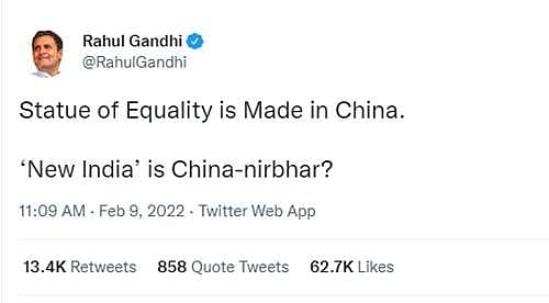 சுயசார்பு இந்தியா என பிரசாரம் செய்துவரும் மத்திய அரசு, தெலங்கானா மாநிலத்தில் பிரதமர் மோடி திறந்து வைத்த சமத்துவத்திற்கான சிலை சீனாவில் உருவாக்கப்பட்டிருப்பதாக காங்கிரஸ் தலைவர்களில் ஒருவரான ராகுல்