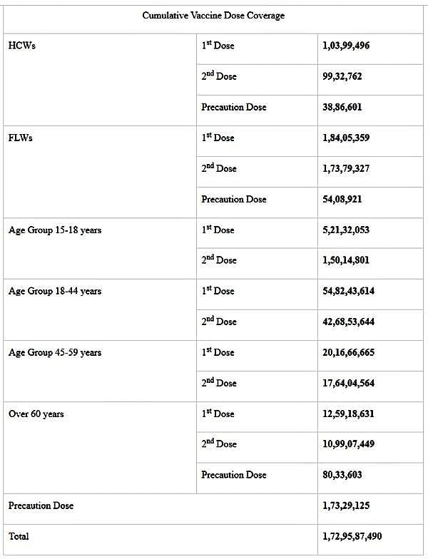 நாட்டில் இதுவரை 172.95 கோடி தடுப்பூசிகள் செலுத்தப்பட்டன: சுகாதாரத்துறை