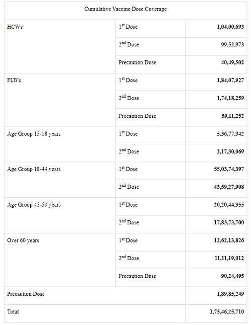 நாட்டில் இதுவரை 175.46 கோடி கரோனா தடுப்பூசிகள் செலுத்தப்பட்டுள்ளதாகவும், கடந்த 24 மணி நேரத்தில் 7 லட்சத்துக்கும் அதிகமான தடுப்பூசிகள் செலுத்தப்பட்டுள்ளதாக மத்திய சுகாதாரத்துறை